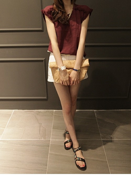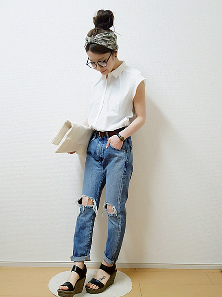 定番アイテム白のノースリーブシャツ。