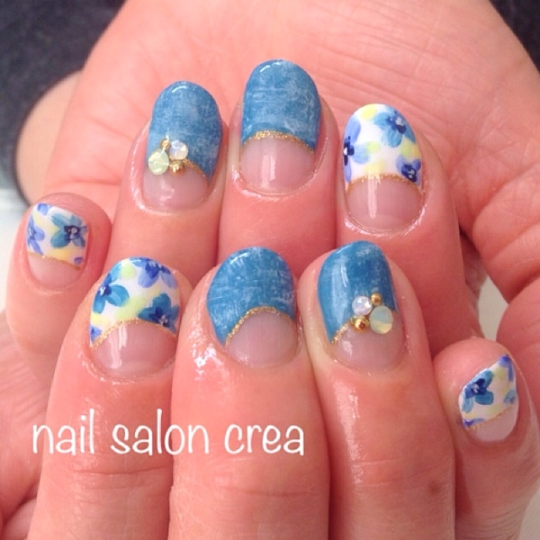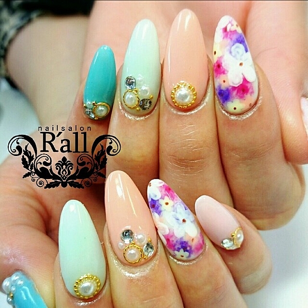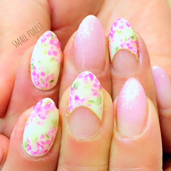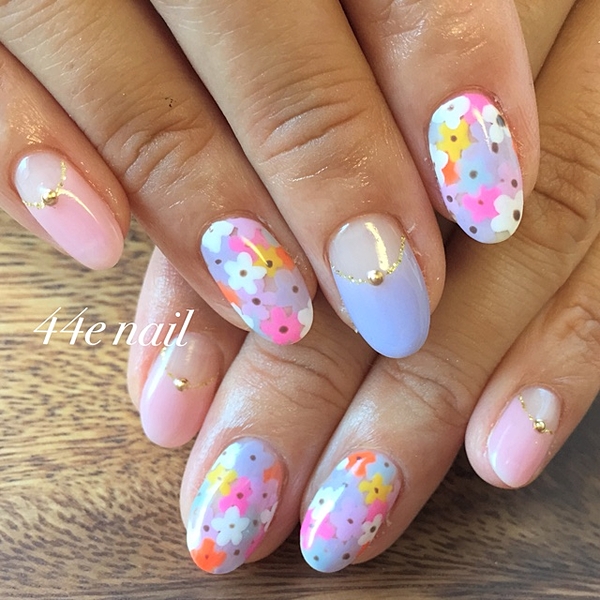 パステルカラーの小さなお花の囲い込みネイル。