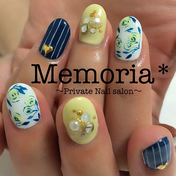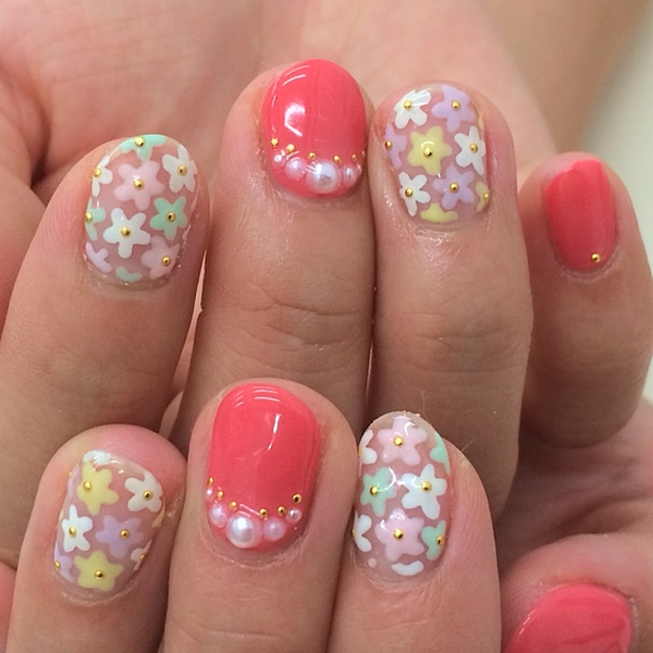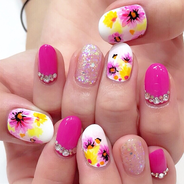指先に小さなお花をたくさん乗せて花束みたいなネイルはいかが?お花のネイルは女の子らしさを引き出して可愛く見せてくれます。お花の色もカラーによってイメージが変わってとってもおもしろいんです。ピンク、黄色、ブルー、カラフルなお花のハンドネイルをご紹介します。