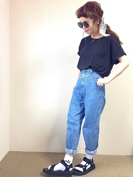 ゆるめのデニムにTシャツのとことんアメリカンコーディネートにバンダナをポニーテールのゴムがわりに投入♡ゆる〜いスタイルによく合います◎