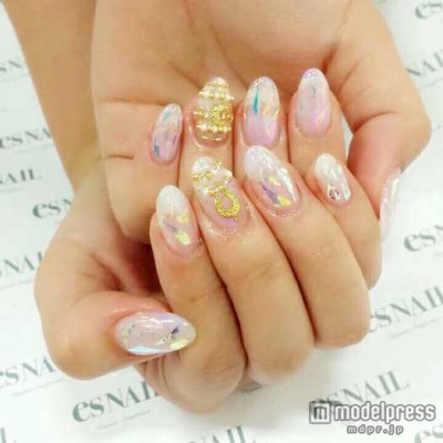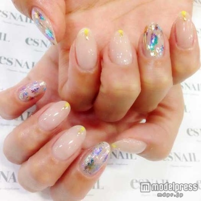 定番のシアーベージュにオーロラフィルムをポイントとしてオン。さりげなく見えて、実は存在感たっぷりの仕上がりに。