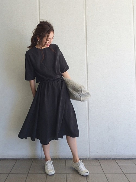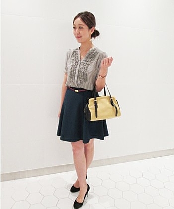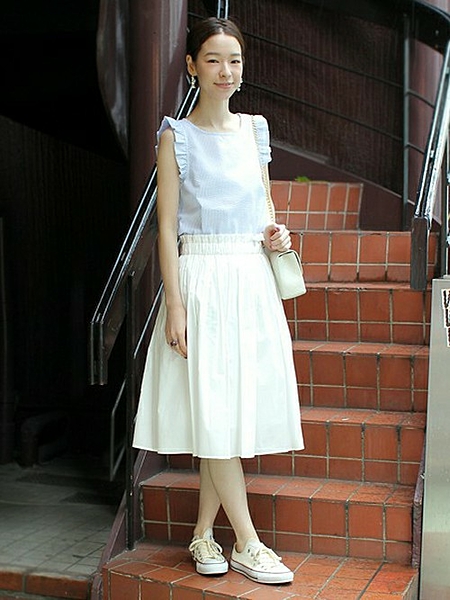 膝丈スカートを合わせた夏の