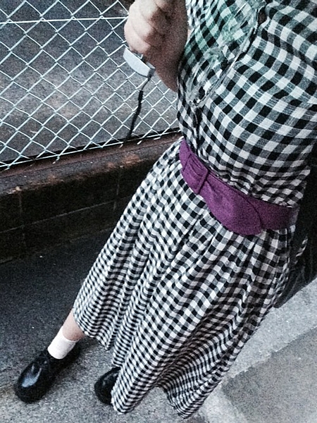 黒チェックのワンピースに、紫のベルトを。