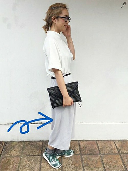 淡いグレーと白コーデには、ブラックなベルトとクラッチバッグを合せます。