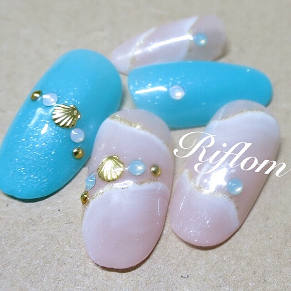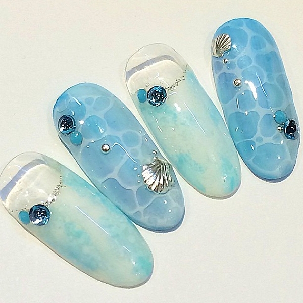 ブルーやパープルのふんわりグラデベースに、ぷっくり大きなシェルが目を引くデザイン!