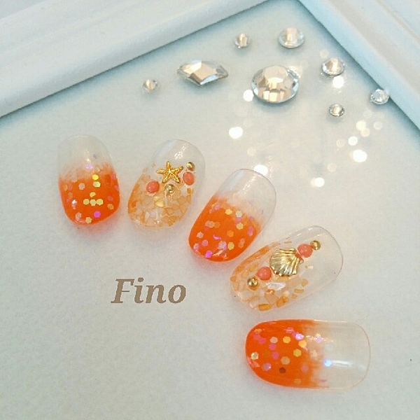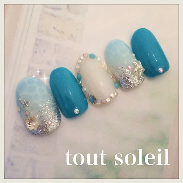 ドロップネイルやシェルを詰めこんだ指が、涼しそうで夏にぴったり♪