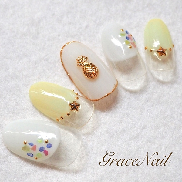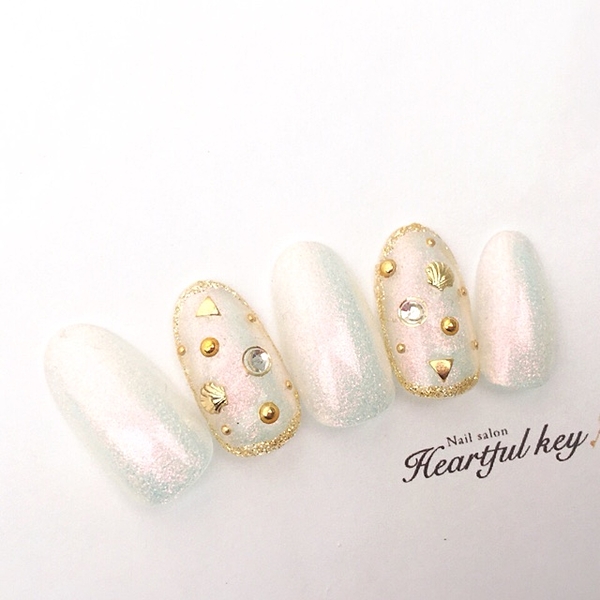 ホワイトベースにストーンやパール、シェルやスタッズをのせて、きれいにまとめています♡