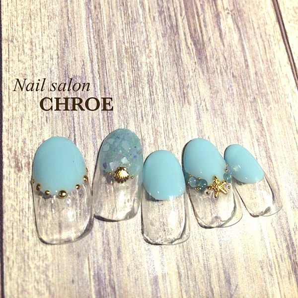 クリアベースにストーンやゴールドシェルでかこみネイルにするのも、涼しそうで海にぴったりのネイルです♪