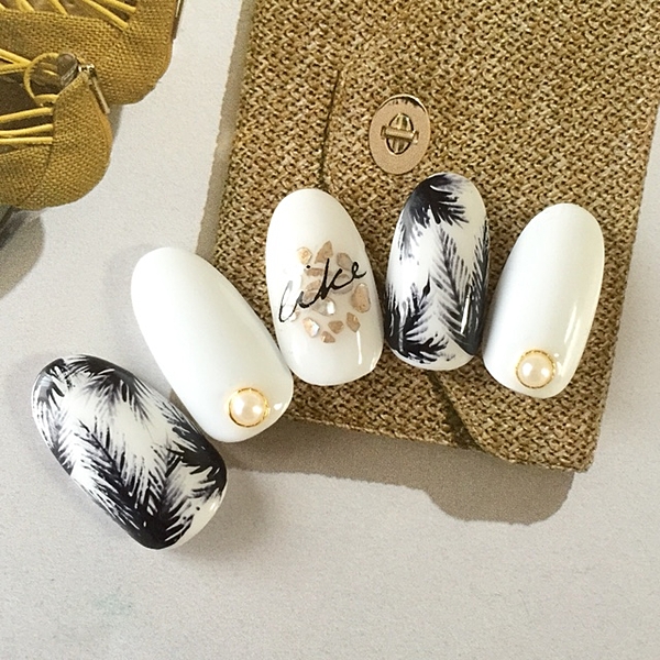 ホワイトベースにブラックのヤシの木とゴールドスタッズが、大人のリゾートネイルにしてくれます♪