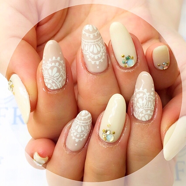 色味を抑えつつもゴージャスに仕上げたデザインは花嫁の手を美しく彩ってくれること間違いなしです。