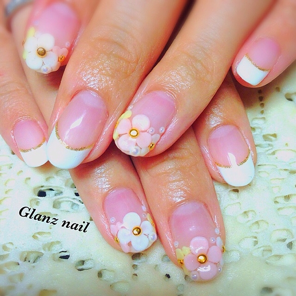 淡いベージュのベースに立体的なお花をプラスした大人可愛いデザインのネイルです。