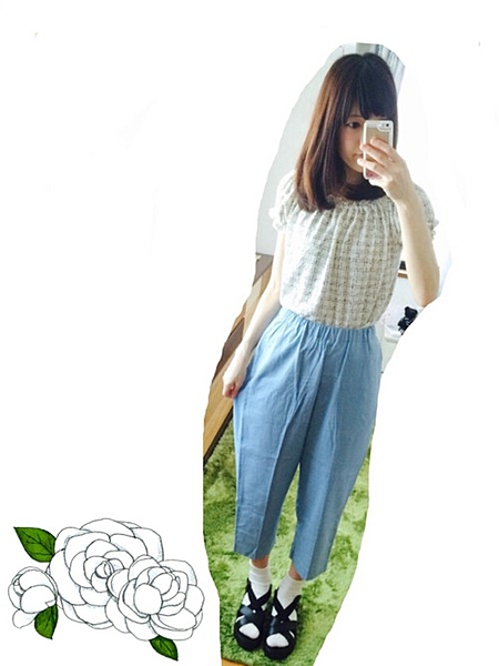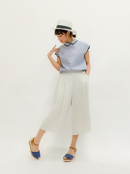流行のガウチョパンツ。ホワイトで広がる分、トップスは引き締めの青でバランスを取って。