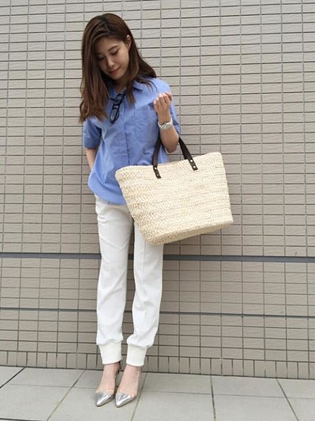 爽やかブルーシャツにパンツでオフィスでもプライベートでも使えるコーディネートに。