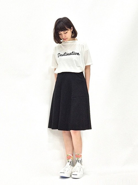 落ち感のある生地を使用した動きのある生地を使用しているので、丈も通常のミドル丈よりも長く設定していますが重い印象になりすぎず着やすいスカートになります。
