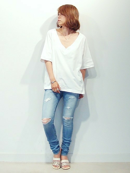 多いめTシャツも深いVネックで着やせ効果を狙いましょう!