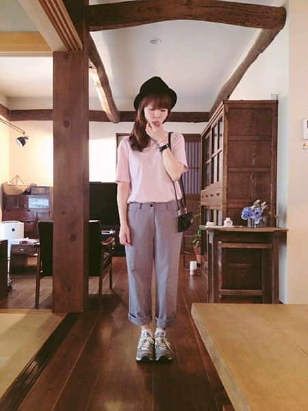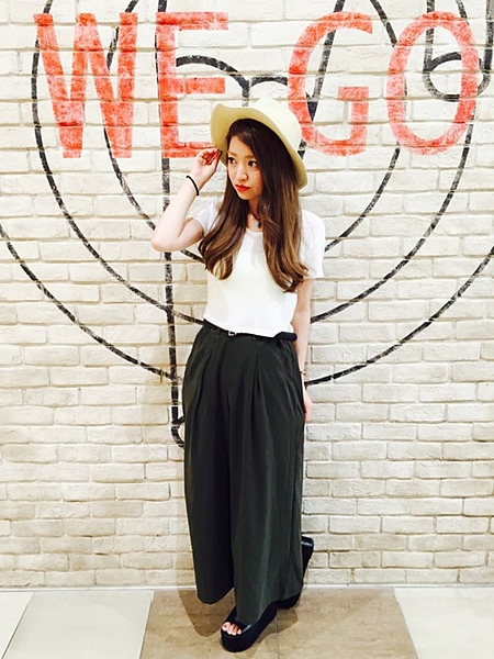 ボリュームのあるワイドパンツもハットなどでバランスをとって!