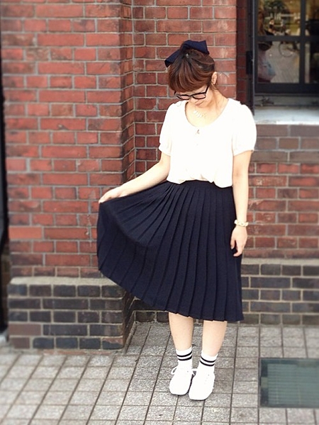 レトロなコーディネートも赤のミディスカートで着やせ効果を♡