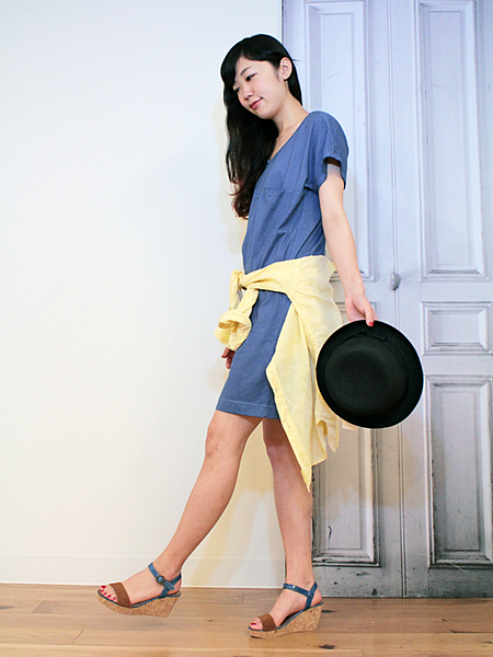 ロゴのプリントと袖に色の切り替えがあるマキシ丈のワンピ。腰にデニムシャツを巻いて、スッキリとした見た目のコーディネートに。