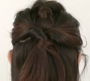 (8)残りの毛も束ねて一つに結び、同様にくるりんぱ。毛束を少しとってゴムに巻きつけてピンでとめ、毛をランダムにつまみ出して立体感を出す