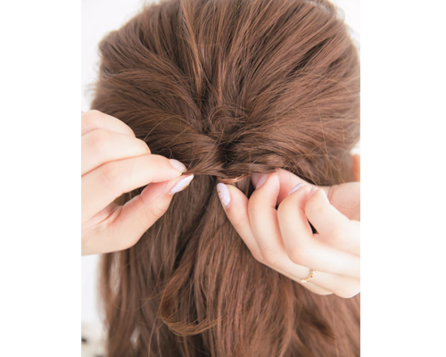 5.結び目の上に穴をあけてくるりんぱ。ちょうど結び目の上あたりに穴をあけて、そこにハーフアップの毛束を外側から通して引っ張る。