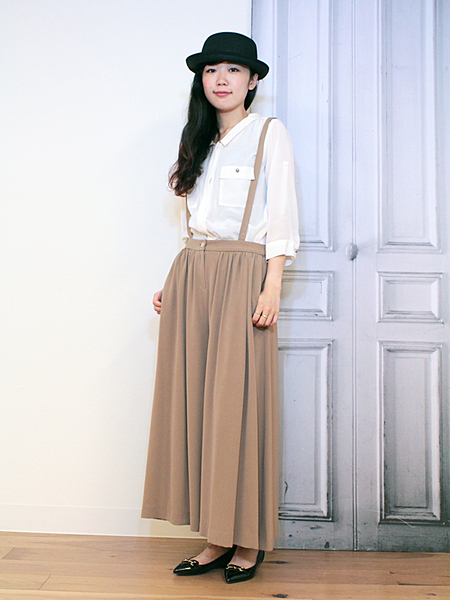 サスペンダー付きロングスカートもモノトーンになるとシックな大人の女の印象に。