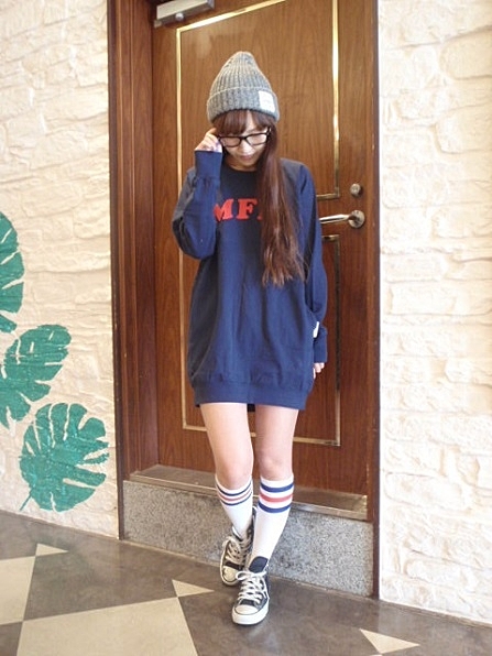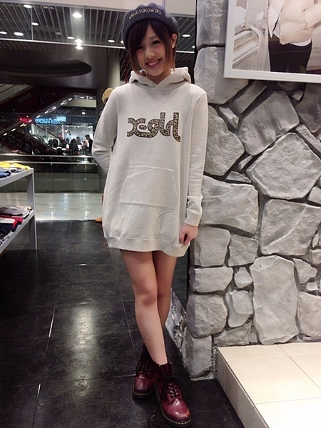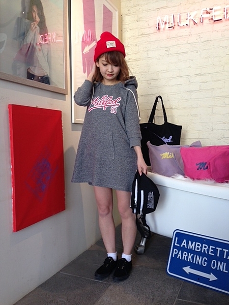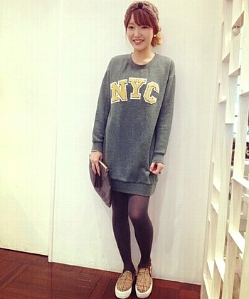 ロゴが入りスウェットワンピースの着こなし