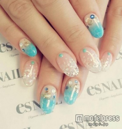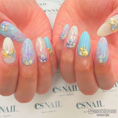 定番カラーのブルー×ホワイトはクリアなグラデーションにすることでオシャレ度アップ。ブルー系ストーンやスタッズ使いがアクセントに効いていますね。
