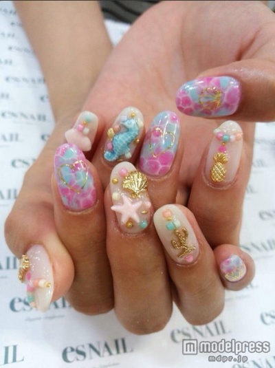 タツノオトシゴやパイン、シェル、スターフィッシュなどのサマーモチーフをとことん取り入れて存在感抜群の仕上がりに。