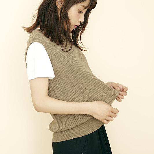 秋色「カーキ」のノースリニットが