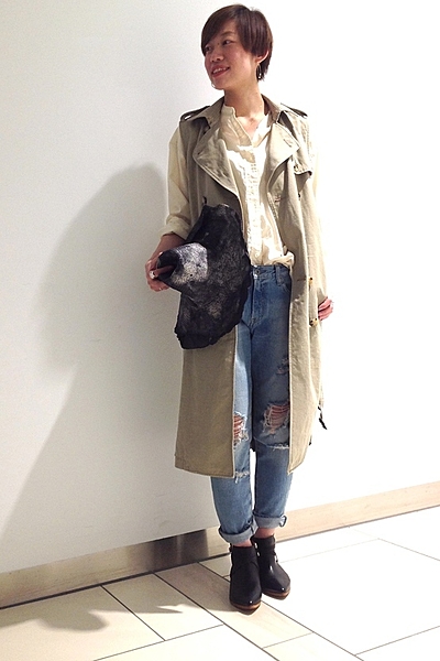 トレンチベストは、ベルトを使わずに前を開けても使える優れもの!