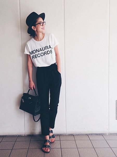 モノトーンコーデも白ロゴTでキメすぎないカジュアルさ。