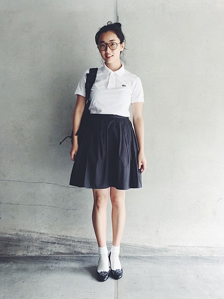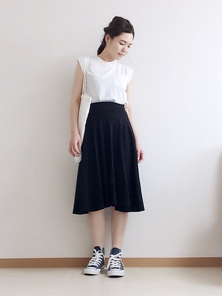 白と黒で大人っぽくまとめつつもスカートとコンバースで可愛らしさを。
