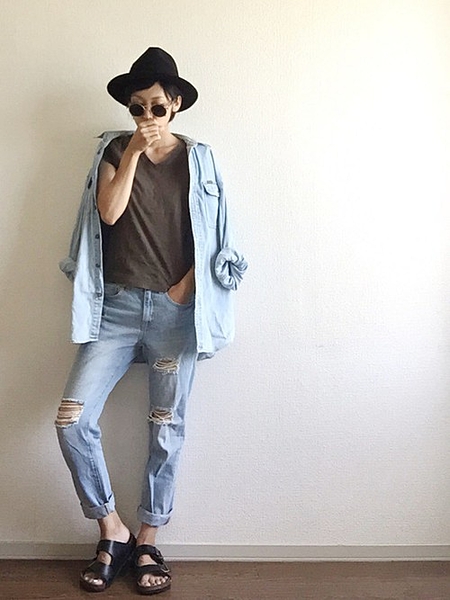 淡いデニムは黒小物で引き締めて!