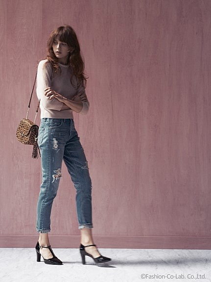 ダメージの効いたデニムパンツ。