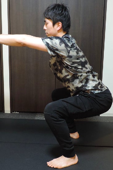 3.背中が丸まらないようにお尻を後ろへ軽く引きながらしゃがみ、太ももが床と平行か、お尻がかかとに着くまでしゃがみましょう(完全にしゃがむまで下ろすと負荷が高くなります)。