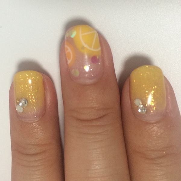 クリアなネイルは目立ちませんが、ポイントでフルーツを入れるとパッと明るくなりますね。