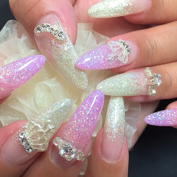 ホワイトをベースにしたラメがパステルカラーでかわいいスカルプネイルですね♪