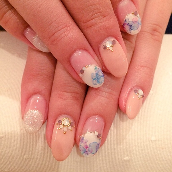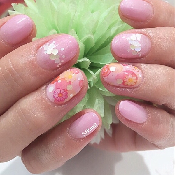 ピンクに水彩画の写ネイルがとってもかわいい写ネイルです♪