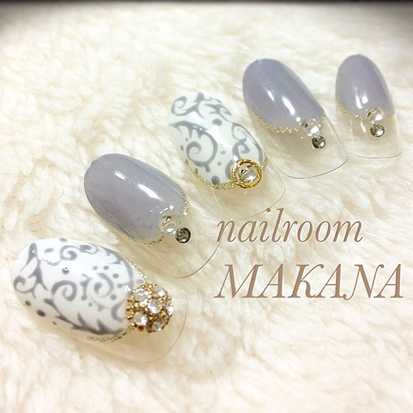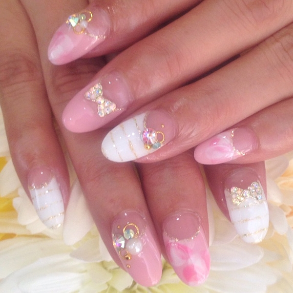 パステルパープル×ピンク×ホワイトの優しいカラーのネイル☆ ストーンの置き方とレースのシールが可愛い★ http://t.co/va4nSpqeex♡