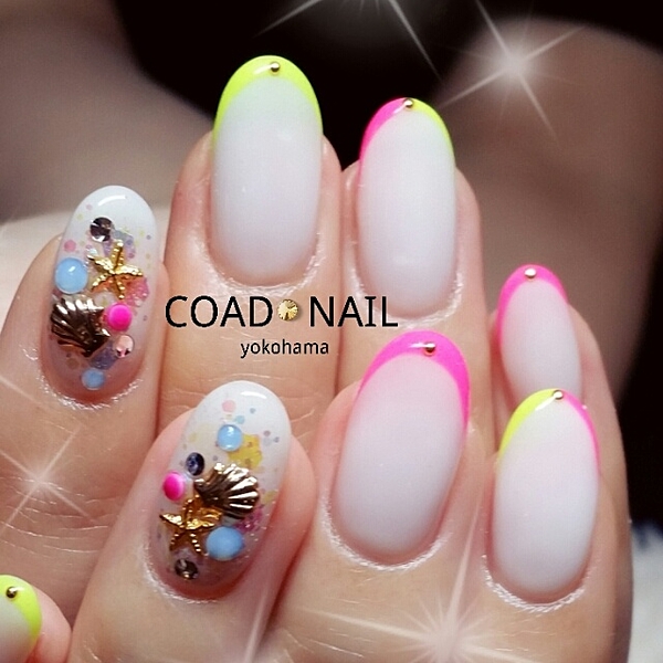 夏ネイルやりたいの多すぎて迷うー。。 おフェロが有力だけどもう一回ドロップもやりたい気もするしスターフィッシュもまたつけたいしカラフルにもしたいー