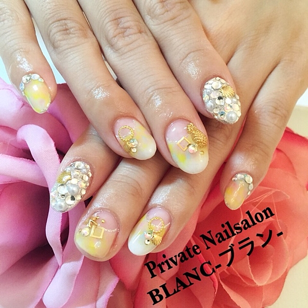 ストーンの他にシェルも入れて夏らしいネイルです。