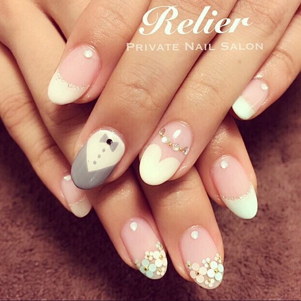 お客様ネイル੯ू•́ू ໒꒱⁼³₌₃明後日が結婚式とのことで新郎新婦さんネイルです♡ウエディングネイルとゆうとホワイト調の綺麗系が多いですがこういったネイルもとっても可愛いです(੭ु ›ω‹ )੭ु⁾⁾♡明後日、楽しんでくださいね♡ http://t.co/MaX7pA0w7t