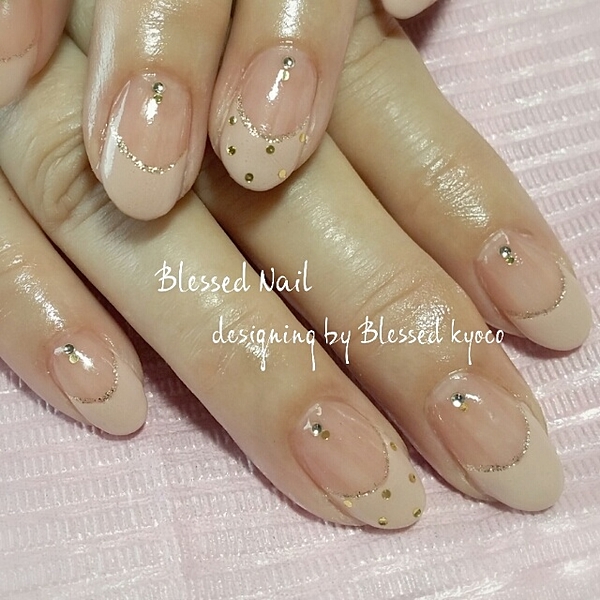 ゴールドの小さめホロのドットをのせた指が、可愛い印象に見せてくれます♪