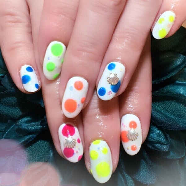 ピンク、イエロー、オレンジ、ブルー、グリーン・・カラフルなネオンカラーでランダムなドットに♪
