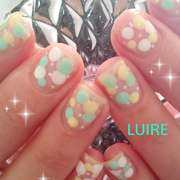クリアベースに、イエローやグリーンのパステルカラーとホワイトのドットを詰め込んだデザイン♡