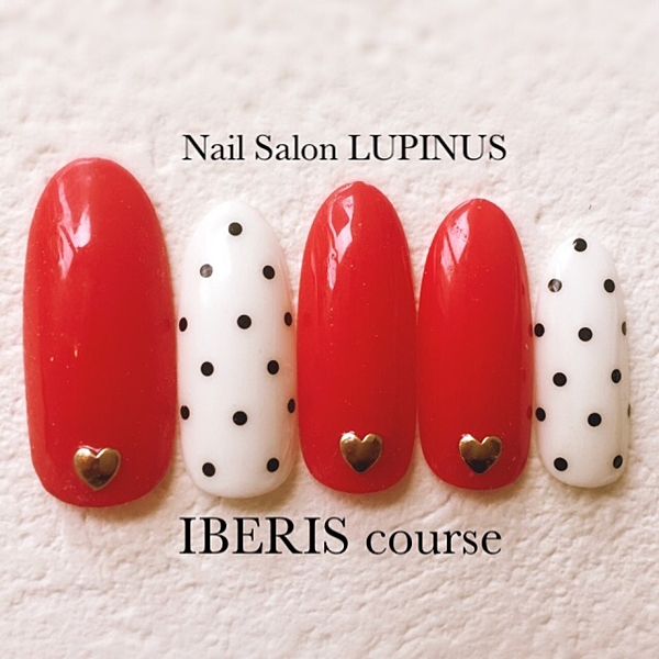 鮮やかな赤でフレンチにして、ホワイトのドットをのせた可愛いデザイン♡