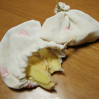 生の生姜1~2片を皮ごとすりおろします。包丁で細かく刻んでもかまいません。ガーゼやフキンなどの布を袋状にし、その中にすりおろした生姜を入れます。入浴中に皮膚に長時間触れると刺激が強すぎる場合がありますので、湯船に入る前に取り出しても良いでしょう。
