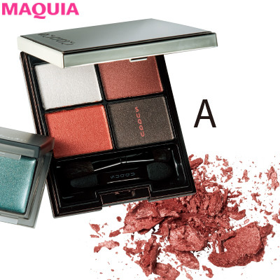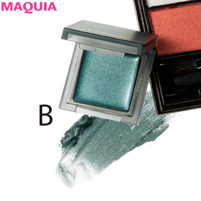 涙袋全体を赤みがかったピンクでふっくら見せつつ、キワは透け感のある深いグリーンで引き締めて、品の良い涼やか目に。暖色と寒色のコントラストをつけることで目元に奥ゆきが出て、目が大きく見えますよ。