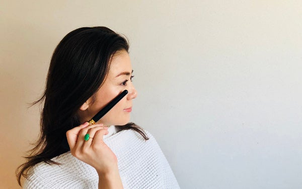 2.顔の側面のエラ部分から、ほお骨を目指すようなイメージで、上斜めにチークブラシを運びましょう。すると「顔の内側に向かって上向き」になるようなラインでチークが入り、自然と顔がリフトアップしたように仕上がります。