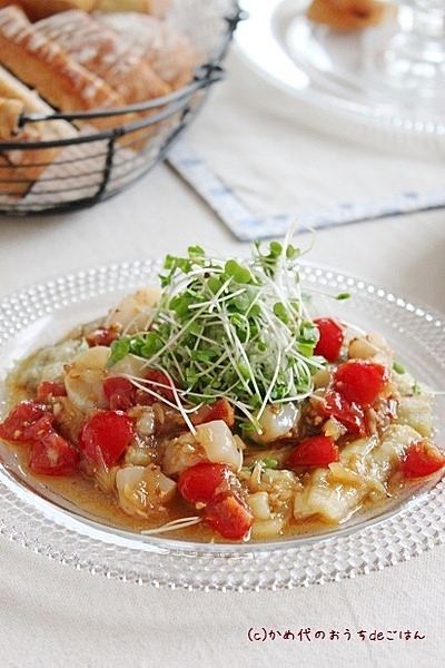 ■焼きなすのカルパッチョ風 ほたてとミニトマトのソース